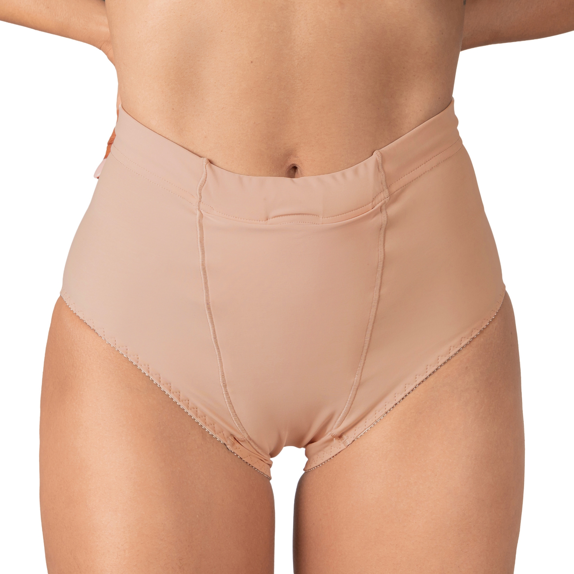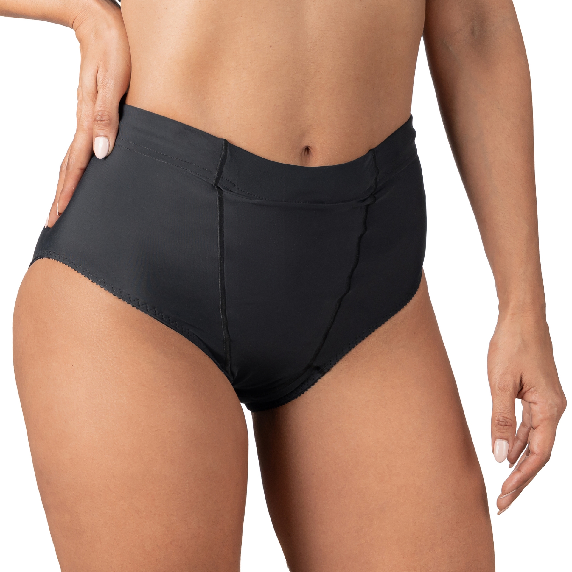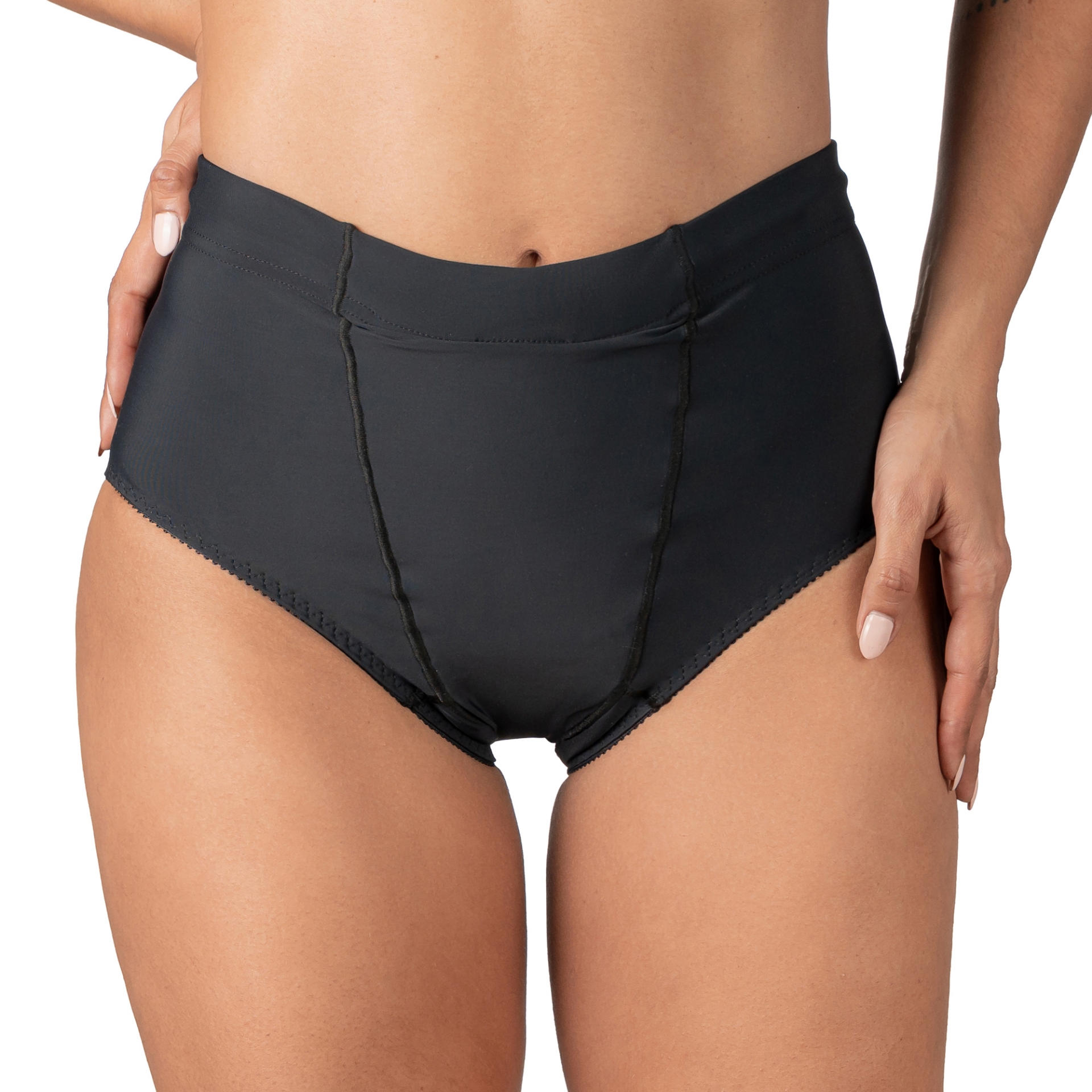 Wear during or after pregnancy including post C-sections for relief from vulvar varicosities, vulvar swelling, and Lymphedema. This garment uses a cotton crotch that works as a sleeve for shields that would be very helpful in the event of female genital discharge common when vaginal infections such as candidiasis are present.